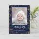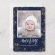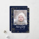 ¡Envíe personalizable y saludos personalizados de vacaciones a amigos, colegas y familia en simples, minimalistas, elegantes, divertidas, festivas y modernas tarjetas fotográficas! Un bello marco de variedad de puntos de confeti dorados de año nuevo sobre fondo azul marino rodea tu foto en papel de borde redondo. El saludo " MERRY " está escrito en caligrafía elegante, y a continuación se muestra el mensaje de saludo personalizado de su apellido en tipografía moderna. Revertir para revelar un hermoso fondo azul marino.