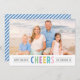 La tarjeta de fotos de vacaciones es sencilla y moderna y cuenta con una foto con una redacción de "Cheers" multicolor y un texto personalizado para un mensaje estacional, el nombre de su familia y el año. La parte posterior de la tarjeta incluye un patrón de rayas diagonales. Los colores alegres, perfectos para una foto de verano/vacaciones, incluyen azul cielo, verde menta, violeta, amarillo dorado, turquesa/azul verde azulado y rosa claro.