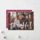 ¡Desee a sus amigos y familiares un feliz Día de Acción de Gracias con estas modernas tarjetas de fotos de Acción de Gracias! La tarjeta muestra "Agradecimiento" mostrado en un guión de pincel blanco escrito a mano con la foto de tu familia horizontal favorita. Personalice la parte delantera de la foto de la tarjeta de Acción de Gracias con su nombre. La tarjeta se invierte para mostrar un patrón follaje blanco con fondo morado de berry.