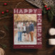 Tarjeta de vacaciones moderna geométrica "Felices Fiestas" con una foto. Fuente y gráficos en blanco. Fondo en la parte frontal y trasera en rojo oscuro. La parte trasera de la tarjeta tiene espacio para texto personalizado adicional.