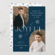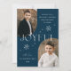 ¡Desee a los seres queridos una feliz temporada de vacaciones enviándoles una tarjeta de vacaciones de moda diseñada por Late Bloom Paperie! La única tarjeta de vacaciones incluye dos fotos dentro de un marco fotográfico azul marino. "Alegre" se exhibe con letras blancas modernas acentuadas por copos de nieve dibujados a mano. Personalice la parte delantera de la tarjeta de fotos de Navidad agregando un mensaje, nombre y año personalizado. La parte posterior de la tarjeta multifoto de vacaciones muestra un patrón de copo de nieve azul marino.