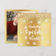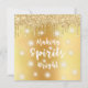 Tipografía moderna de escritura manuscrita que dice MAKING SPIRITS BRIGHT acentuada con luces centelleantes contra un fondo chic de goteo de purpurina dorada en la parte delantera con tu foto y mensaje personal en la parte trasera. CAMBIOS: Cambia el estilo de la fuente del texto, tamaño, color y ubicación haciendo clic en PERSONALIZAR MÁS. CONSEJO DE FOTO: Para obtener resultados más rápidos y mejores, elige una foto con el sujeto en el medio y/o pré-córtala en forma cuadrada ANTES de subirla. Contacta al diseñador a través de Zazzle Chat o makeitaboutyoustore@gmail.com si deseas que se modifique este diseño, en otro producto o deseas artículos coordinados.