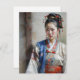 Una mujer joven está vestida con atuendo tradicional, con una intrincada peluquería con adornos rojos. Se encuentra en un fondo mudo, con una expresión serena en su rostro.
