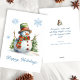 Envía un torrente de alegría esta temporada con un encantador muñeco de nieve pintado con acuarela, vestido con un sombrero verde con una banda roja festiva, una bufanda a rayas rojas y verdes, y botones de carbón clásicos. De pie alegremente frente a dos pinos nevados y rodeado de delicados copos de nieve, este diseño combina el atractivo moderno de las tarjetas de Navidad de muñecos de nieve clásicos con elegantes pinos nevados pintados con acuarela y un toque de encanto navideño escandinavo.