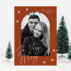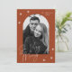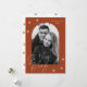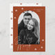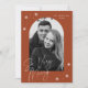 Tarjeta de vacaciones moderna y elegante con tu foto mostrada dentro de un marco de arco de canela. En las esquinas se muestran hermosos copos de nieve blancos con la frase "Muy merry" en un guión blanco a la moda. Personalice la parte delantera de la tarjeta de Navidades de fotograma de arco agregando su nombre y el año. La tarjeta se invierte para mostrar un patrón de copos de nieve de color canela.