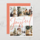 Tarjeta de vacaciones para Navidades con cuatro fotos de familia editables y un guion naranja de caligrafía con letras de la palabra "alegre" en el centro.