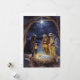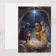 Comparte el verdadero significado de la Navidad con esta impresionante tarjeta plana de vacaciones con una ilustración tradicional de la escena del Nacimiento. Este diseño artístico representa a los Tres Reyes Magos ofreciendo regalos al bebé recién nacido en el pesebre bajo una brillante Estrella de Belén en un pacífico establo rústico. Los colores intensos, el cielo estrellado nocturno y la luz dramática crean una imagen reverente, evocadora y atemporal. Esta tarjeta es una forma elegante y significativa de enviar saludos de Navidad y deseos de paz y alegría para la temporada.