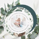 Envíe saludos y deseos de vacaciones a amigos, colegas y familia en festividades de diseño fotográfico simple, lindo, moda, elegante y moderno, color natural estilo de color de las tarjetas de vacaciones! Una hermosa corona de flores de hojas de acuarela pintadas de color verde suave (pino, eucalipto, helecho) con conos de pino marrón bonito y magnolia de marfil delante. El centro presenta su foto rodeada por su mensaje de bienvenida personalizado " deseándole lo mejor esta temporada navideña " en tipografía romana, nombres y el año.