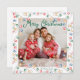 Cuidada cadena acuática de luces de Navidades forma un borde de vacaciones de bonito alrededor de tu fotografía familiar favorita de este invierno. Un guión verde cursivo divertido lee Feliz Navidad a través de tu fotografía. Personalizar estas tarjetas con un mensaje o una carta de Navidades en la parte posterior bajo la cadena de luces de Navidad.