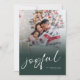 Superposición de fotografía familiar 2026. Navidades De Guión Alegres Del Calendario Verde Oscuro. Disponible digitalmente e impreso. Simplemente reemplace la foto de ejemplo con la suya propia y la personalice con sus nombres y año. Joyful está en un elegante y lúdico guión en blanco que puede cambiarse a otro color si así lo desea. En la parte posterior hay un práctico calendario 2026 para los destinatarios.