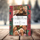 Navidades brillantes, audaces y coloridos botánicos con poinsettia roja profunda florecen sobre fondo verde oscuro cazador. Incluye una plantilla de dos fotos y campos de texto editables.