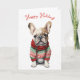 Bulldog francés acuarela con suéter verde y rojo y copos de nieve. Todo el texto es editable.