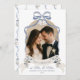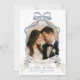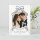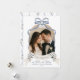 Celebra la alegría de tu primera temporada navideña junto con esta elegante tarjeta fotográfica de boda de la Primera Navidad. Con el retrato de una pareja de personalizados enmarcado con acentos de cinta acuarela, flor de invierno festivo y suave, esta tarjeta de Navidades personalizada para recién casados es el placer perfecto para compartir tu amor con la familia y amigos. El diseño resalta su foto boda, complementada con una tipografía clásica que anuncia "Primera Navidad como Mr. & Mrs.", junto con sus nombres elegantemente impresos a continuación.