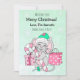 Adorable tarjeta caprichosa dibujada a mano con un lindo ratón festivo usando un sombrero de Papá Noel sosteniendo un bastón de caramelo rodeado de regalos. Sólo tienes que añadir tus nombres en el área de personalización. Tarjeta temática de Navidades rosados.
