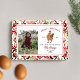 Ilustracion de un pollo con sombrero de santa. El borde y el reverso son de color rojo y verde acuarela diseño de patrones de azulejos florales. Personaliza tu foto familiar.