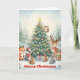 Comparte alegría navideña con esta tarjeta de acuarela que incluye bonitos animales de bosque reunidos alrededor de un árbol de Navidad decorado en un bosque nevado.