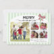Esta tarjeta de Navidades horizontal presenta un alegre y reconfortante collage de fotos familiares enmarcadas en un suave y verde borde rayado. En la parte superior, se muestra de forma destacada la frase "recuerdos MERRY", que combina un tipo de letra atrevido y festivo con un guión elegante. Un arco de cinta rosa y verde le da un toque festivo alegre en la esquina superior derecha. La tarjeta ofrece espacio para cinco fotos familiares, una más grande y cuatro más pequeñas cuadradas y texto personalizado, en el reverso, para un mensaje personal. El diseño transmite amabilidad, conexión y celebración, lo que lo convierte en un encantador saludo de vacaciones.