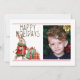 Tarjeta de Navidades de fotografía Happy Holidays One Photo con un conejo adorable Navidad vestido de rojo y verde con regalos envueltos.