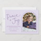 Pastel Green Modern Arch Peace Joy Foto Navidades Tarjeta de vacaciones. Paz + Alegría en un guión de estilo escrito a mano. Una foto en arco tiene un giro moderno con un lindo borde de vieiras y una frontera exterior que resalta el año. Se muestra en una relajante combinación de colores de púrpura pastel monocromático, aunque todos los colores (frontal + posterior) son editables, incluyendo elementos de fondo, texto y diseño. Mantenga el mensaje esperanzador como se muestra o personalizar con su propio texto. Personalice la plantilla con su nombre o nombres y foto. La parte trasera de la tarjeta es un divertido patrón disperso de palomas - algunas ramas en cartera y otras sosteniendo un adorno. © Kimbellished, LLC