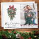 Moderna y elegante caligrafía Ink Script Watercolor Pines Winter Greeneration con Ornamentos de Navidad Borgoña Cinta Roja Bow, Cones de Pino y Holly Berries Photo Merry Christmas Card