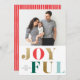 Una moderna tarjeta fotográfica de vacaciones que combina oro y un mensaje alegre en rojo y verde JOYFUL.
