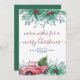 Elegante, simple y tradicional tarjeta de vacaciones con diseño de acuarela y tipografía manuscrita. El diseño se compone de plantas huecas, mistletoe, brotes de pino y un camión rojo vintage con un árbol de navidad decorado con luces de cuerda. La plantilla está configurada para que añada el inicio de sesión y los nombres.