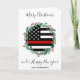 Envíe saludos navideños de Feliz a amigos y familia con esta tarjeta única de Navidades de bomberos de la línea roja delgada - corona de feriado en un diseño de la bandera estadounidense en los colores de la bandera del bombero, moderno diseño rojo y blanco negro con bayas y aliños. Personaliza con el apellido. Esta tarjeta de Navidades para bomberos es perfecta para familias de bomberos o tarjetas de navidades del departamento de bomberos. DERECHOS RESERVADOS © 2020 Judy Burrows, Black Dog Art - Todos los derechos reservados. Navidades de la línea roja delgada de bomberos usan tarjeta de vacaciones