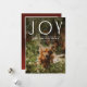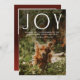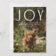 Esta simple tarjeta de vacaciones para Navidades tiene la palabra JOY en una gran tipografía moderna encima de una foto de un perro tierno tipo recuperación. Puedes personalizar esto con tus propias fotografías, tu nombre de familia y tu saludo y un mensaje personal en la parte de atrás, si eliges (o dejas en blanco).