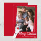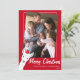 Una tarjeta vertical de fotos plana de vacaciones para Navidades que muestra tu foto, con una inclinación, y una llama personalizado, usando un sombrero de Santa que está mirando desde el lado inferior izquierdo de la tarjeta en un fondo rojo. La parte trasera de la tarjeta es roja. La foto es una plantilla para cambiarla por la tuya.