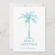 Envíe sus saludos navideños de playa esta temporada con este moderno diseño de vacaciones verde azuladas, blancas y grises con una elegante tipografía y una palmera tropical con las palabras "Mares y saludos".