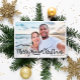 Comparte tu foto favorita de las vacaciones en la playa con esta divertida y moderna tarjeta de fotos navideña con una moderna tipografía escrita a mano que dice "Navidades de la playa de los cerezos" decorada con olas, sol y ilustraciones de surf. Fácilmente personalizable con una de sus fotos favoritas de vacaciones y sus nombres. La parte posterior de la tarjeta presenta un patrón de onda en azul y blanco.