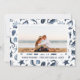 Tarjetas fotográficas navideñas de playa. conchas tropicales, pez estrella, cangrejo, dólares de arena, patrón de caballitos de mar en azul.