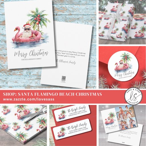 Disfrute del espíritu de las vacaciones con esta tarjeta de Navidades plegados única que incluye un Santa Claus relajado con gafas de sol tumbado en un flamenco rosa flotando en el océano. Perfecto para enviar deseos de vacaciones en la playa, esta tarjeta es ideal para cualquiera que viva en lugares tropicales como Florida, Hawaii o Bahamas —o para cualquiera que simplemente ame una onda costera. En la parte delantera se exhibe una encantadora acuarela rústica con Santa, una palmera decorada con adornos, suaves olas del océano y una pequeña isla a lo lejos. El diseño combina fuentes simples con tipografía de guiones para un ambiente informal pero elegante. El interior incluye espacio para tu mensaje de vacaciones, ya sea impreso o manuscrito, dándole la flexibilidad de personalizarlo a tu manera. Una forma divertida y alegre de añadir un poco de surf y arena a tus saludos de Navidad. Disponible como tarjeta plegada impresa o como descarga digital para imprimir o enviar por correo electrónico.