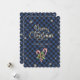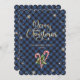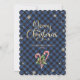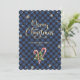 Caligrafía azul Tarjeta navideña de Feliz Navidad con copos de nieve, Navidades con latas de dulces, bayas azules y rojas en un fondo azul de manta de búfalo.