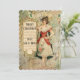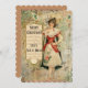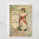 Este diseño victoriano presenta a una mujer de hadas vestida de rojo, rosa y blanco, sosteniendo una partitura de papel para anunciarla a los observadores.
