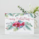 Tarjeta de vacaciones simple y elegante, personalizada con su mensaje y nombre. Esta acuarela tiene guirnaldas de vegetación y vegetación de invierno, poinsettias, bayas y brotes de pino. Feliz Navidad está escrito a mano en caligrafía elegante y tu texto personalizado está impreso en tipografía moderna. La parte trasera de la tarjeta tiene un borde de bosque invernal. Por favor, busque en mi tienda artículos de coordinación, regalos y decoración de casa.