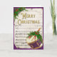 Esta tradicional tarjeta navideña plegada de Feliz Navidad cuenta con una hoja de Navidades vintage, carol, que se desplaza detrás de un tambor decorado con varias estrellas de vegetación, bayas y flores. El diseño de los Navidades de vacaciones tiene un fondo malva metálico. Feliz Navidad es con letras de oro decorativas en el frente, y un mensaje de vacaciones con personalización está adentro.