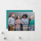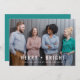 Elegante tarjeta de felicitación plana del equipo de viajes corporativos de negocios con una tipografía audaz con la frase "Merry + Bright" en blanco con un vibrante color verde turquesa al revés. El saludo y el nombre de la empresa se pueden personalizar fácilmente para que se adapten a su propio negocio. El diseño presenta un mensaje opcional para que sus clientes en general se den las gracias por su negocio y lealtad y les desean paz, prosperidad y alegría en la temporada de fiestas. Un diseño moderno, divertido y profesional para destacar en esta temporada de vacaciones. La imagen que se muestra es para fines de ilustracion y sólo debe ser reemplazada por su propio retrato de equipo u otra foto. La imagen de marcador de posición es de un equipo de cuatro inclinados casualmente contra una pared metalizado gris.