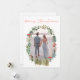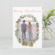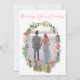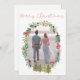 Tarjeta de felicitación de temporada con una foto enmarcada con una corona floral para Navidades, con un audaz guión rojo "Feliz Navidad" encima. Tarjeta de navidades sencilla pero elegante. Alegre perfecto para parejas recién casadas.
