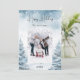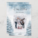 Bosque de invierno acuático como fondo. Personaliza y agrega tu apellido y una foto. Superposición de nieve. Felices vacaciones escritas con un moderno guión de estilo a mano. Atrás: agrega tu mensaje y nombres.