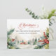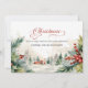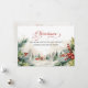 Este bonito diseño presenta un gráfico de texto de caligrafía "Navidades" personalizado y un verso de Navidades sentidos sobre un fondo de color agua, incluyendo un apacible paisaje cubierto de nieve con cabañas, pino y holly. La parte posterior presenta campos de texto y de elementos en blanco y opacos complementarios para su mensaje y personalización.