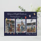 Tarjeta de vacaciones azul oscuro, moderna, sencilla y alegre con 3 fotos familiares enmarcadas en blanco. Navidades merry y brillantes editables y una tipografía de escritura blanca de Año Nuevo Feliz. Decorada con colores vivos y coloridos de luces Navidades. Personalizar y personalización con el año y el nombre de la familia para hacerlo único. La parte posterior de la tarjeta presenta la misma cadena de luces Navidades Crédito de las fotos del marcador de posición: Nate Johnston de Unsplash!