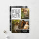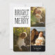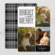 Tipografía negra minimalista brillante y merry, tarjeta fotográfica de vacaciones. Características de la tarjeta, 3 collage de fotos, soporte simple de patrones de manto blanco y negro y tres líneas de texto de plantilla para su saludo, nombre y año.