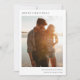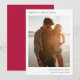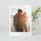 Elegante tarjeta fotográfica mínima de vacaciones con la tipografía clásica "Feliz Navidad" en negro sobre un simple fondo blanco minimalista y un rico color rojo al revés. La foto, el saludo de vacaciones y el nombre se pueden personalizar fácilmente para un toque personal. Un diseño de navidades sencillo, minimalista y contemporáneo que destaca en esta temporada de vacaciones. La imagen que se muestra es para fines de ilustracion, para ser reemplazada por su propia foto. La imagen de marcador es la de una pareja que camina por la playa con el fondo de la puesta de sol.