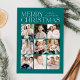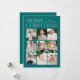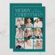 Tarjeta fotográfica navideña moderna con "Feliz Navidad" mostrada en la parte superior del diseño con letras blancas de moda con un fondo verde azulado. A continuación se muestra un collage de 9 fotos en un diseño de cuadrícula. Personalice la tarjeta de Navidades multifotográficos con su apellido. La tarjeta se invierte para mostrar un fondo verde azulado con puntos blancos sutiles (nieve).