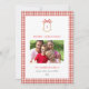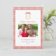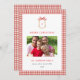 Captura el espíritu de la temporada con esta encantadora tarjeta de felicitaciones de Navidad retro con una bonita frontera de mantas rojas y blancas de gingham. Un bonito escudo monogramado de acuarela pintado a mano con arco le da un toque de elegancia personalizada. Personalizar con la foto inicial de tu familia y una preciada foto para un diseño adorable que refleja su encanto del sur.