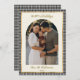 Navidades Retro Black Gold Plaid Arch con tarjeta navideña feliz. Celebre la temporada con estilo con esta elegante tarjeta de Navidades de fotografía de plástico con un borde negro de gingham y un moderno marco fotográfico en forma de arco. Personalízalo con tu foto familiar favorita, con textos de plantilla "Felices Fiestas", nombre de la familia y el año. El diseño festivo se resalta con la elegante tipografía de faux-gold Happy Holidays, creando un ambiente cálido y atemporal. La parte trasera muestra un patrón de gingham negro y blanco roto para un acabado coordinado y pulido. Una tarjeta de vacaciones perfecta para compartir con la familia y los amigos.