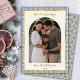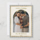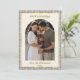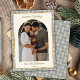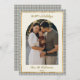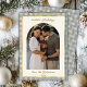 Navidades Retro Green Gold Plaid Arch con tarjeta navideña feliz. Celebre la temporada con estilo con esta elegante tarjeta de Navidades de fotografía de plástico con un polvoriento borde verde de gingham y un moderno marco fotográfico en forma de arco. Personalízalo con tu foto familiar favorita, con textos de plantilla "Felices Fiestas", nombre de la familia y el año. El diseño festivo se resalta con la elegante tipografía de faux-gold Happy Holidays, creando un ambiente cálido y atemporal. La parte trasera muestra un patrón de gingham verde sabio a juego para un acabado coordinado y pulido. Una tarjeta de vacaciones perfecta para compartir con la familia y los amigos.