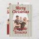 Esta retro y vintage tarjeta plana de doble cara de Navidad tiene rayas verdes, tipografía roja y un marco de foto ovalado. Inserta tus fotos favoritas y personalizar a tu gusto. Fotos de prostooleh / Freepik.