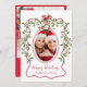 En la carta de bienvenida de los Navidades de tendencia con un borde de marcos ondulados rojo y brillante adornado con ilustraciones de acuarela de un arco de coqueta roja y vegetación de mistletoe de temporada, su foto se muestra en un marco oval de punteado rojo pintado a mano, "Felices Fiestas" en un guión rojo juguetón, y su nombre familiar con letras modernas y simples. En la parte posterior, agregue una foto adicional, personalice su saludo y agregue sus nombres en un guión tipo firma.